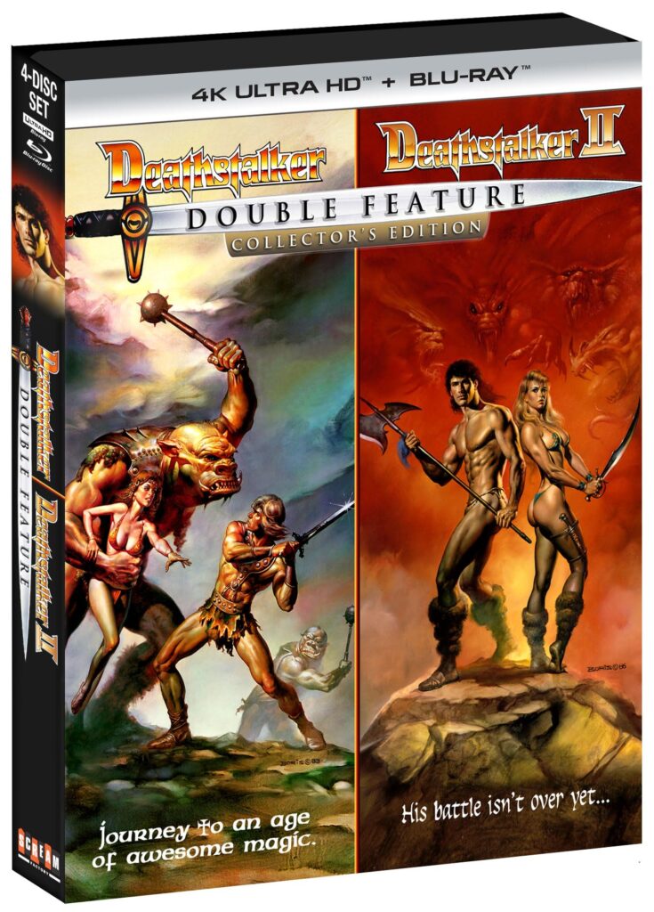 Deathstalker has a mission: to save the kingdom from the wicked grip of the immoral wizard Jerak and his queen, Sultana, who have ruled the land by creating an evil twin of the lovely Princess Evie. Capturing the real Princess Evie, Deathstalker must now return her to her rightful place of power—but the swordsman’s battle has just begun.